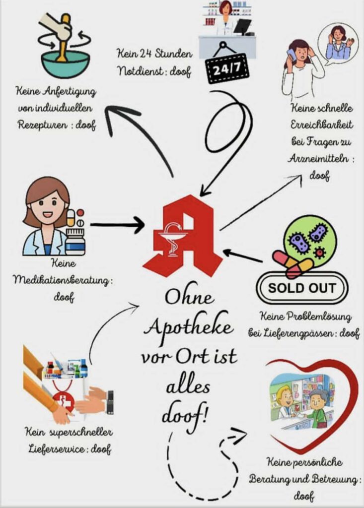 Wir werden am Montag, dem 23.03.2026, unsere Apotheke geschlossen halten und in Berlin für eine im Koalitionsvertrag zugesagte Honoraranpassung protestieren. Das System der Preisgestaltung für die Apotheken wurde seit mehr als 13 Jahren nicht mehr angepasst – aber auch wir Apotheken sind von der allgemeinen Kostensteigung betroffen. Die Unterfinanzierung führte bereits und wird auch weiterhin das Apothekensterben fortführen.